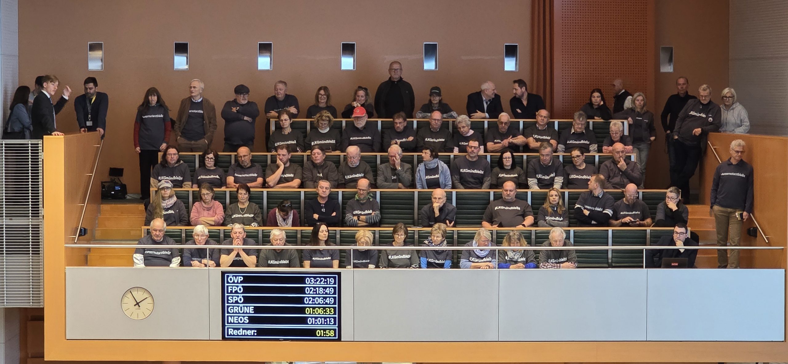 Abgeordnete können sich nicht an so einen EKLAT erinnern: Der NÖ-Landtagspräsident ließ heute am 20.11.25 die Tribüne räumen, auf der sich an die 80 AktivistInnen für den Erhalt von 11 Notarztstandorten und des Landesklinikums Gmünd völlig friedlich eingefunden hatten. Landtagspräsident Wilfing drohte nach einem Beklatschen der (guten) Rede der grünen Abgeordneten Moser mit der Räumung. Und nach dem zweiten Klatschen und einem leisen Klimpern mit Schlüsseln verlor Wilfing die Nerven, es entlud sich ein Disput. Es gibt wenig geduldigere Menschen als WaldviertlerInnen. Doch die heutige Provokation mit einem Beschluss von 4 Landtagsparteien, dass 156 Millionen in Waldviertler Spitäler investiert werden sollen, aber Null davon im Bezirk Gmünd, ist so, wie wenn in einer Familie alle große Weihnachtgeschenke bekommen, nur ein Kind nicht. Und wenn dieses zu fragen wagt, warum nicht, wird es ins Freie verwiesen….Doch wir kommen wieder. Und die Verschlechterung der gesundheitlichen Versorgung für 200000 Menschen in Gmünd und um die Notarztstandorte wird auf die Dauer nicht zu ignorieren sein.